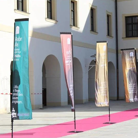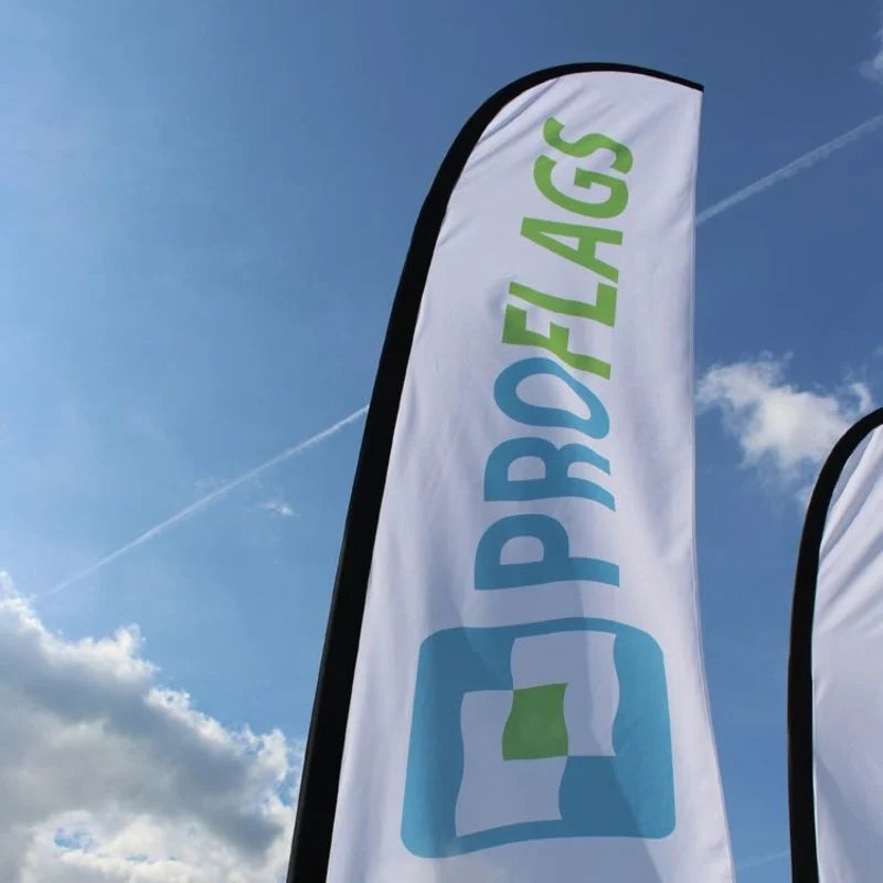 Les drapeaux sont disponibles en quatre tailles (XS à L) avec des impressions de différentes dimensions (70x150 cm pour XS, 90x180 cm pour S, 100x240 cm pour M, et 100x300 cm pour L) et une hauteur totale variable (200 cm à 400 cm). Ils sont fabriqués en toile polyester standard (115 g/m²) ou en textile polyester perforé (120 g/m²). L'impression peut être réalisée par sublimation thermique ou sérigraphie pour des quantités importantes, avec un maximum de 4 couleurs. Les finitions incluent une tige noire ou blanche et un ourlet à couture doublée. Les drapeaux sont lavables à 30ºC et sont principalement utilisés pour la communication d'entreprises, événements, festivals, ou comme supports de sponsors. Le poids varie entre 0,3 et 3,4 kg.